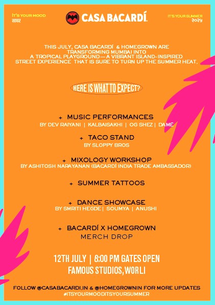 Fashion lovers can get their hands on exclusive, limited-edition BACARDÍ X Homegrown summer merchandise, designed especially for this event. Meanwhile, foodies can indulge in a delicious spread curated by Sloppy Bros, featuring street-style eats with a tropical twist.